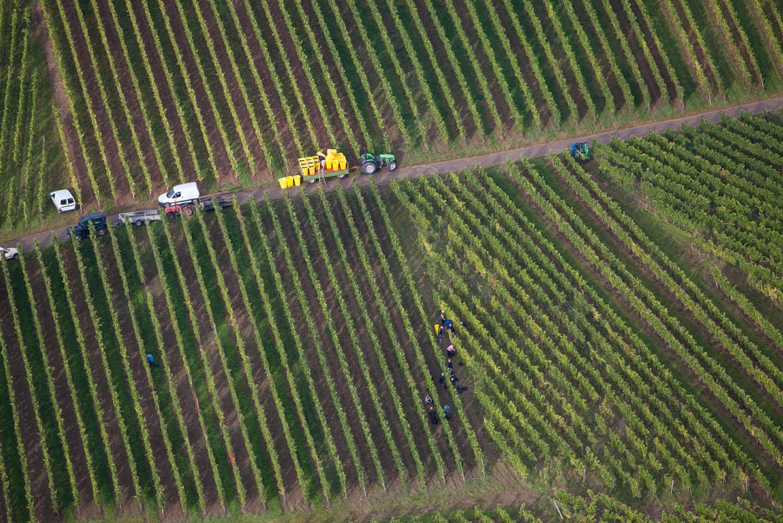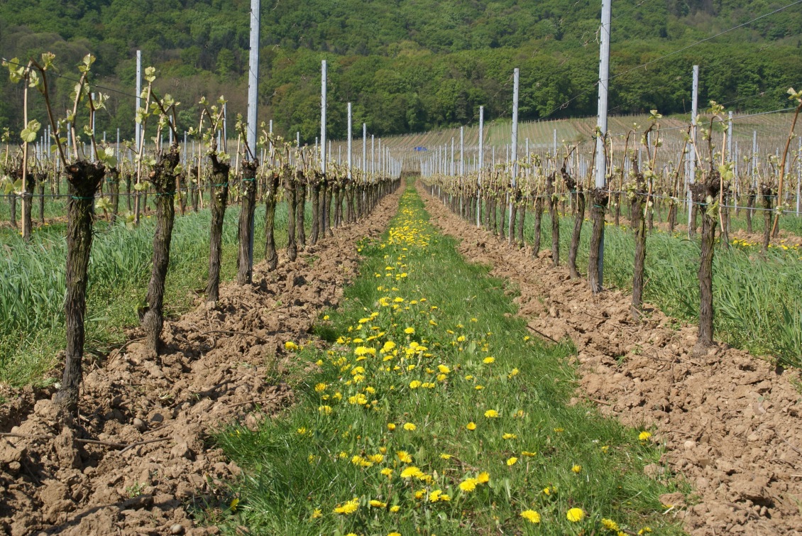 Le rang non labouré est laissé en enherbement naturel pour une plus grande diversité de faune et flore, créant un équilibre naturel.